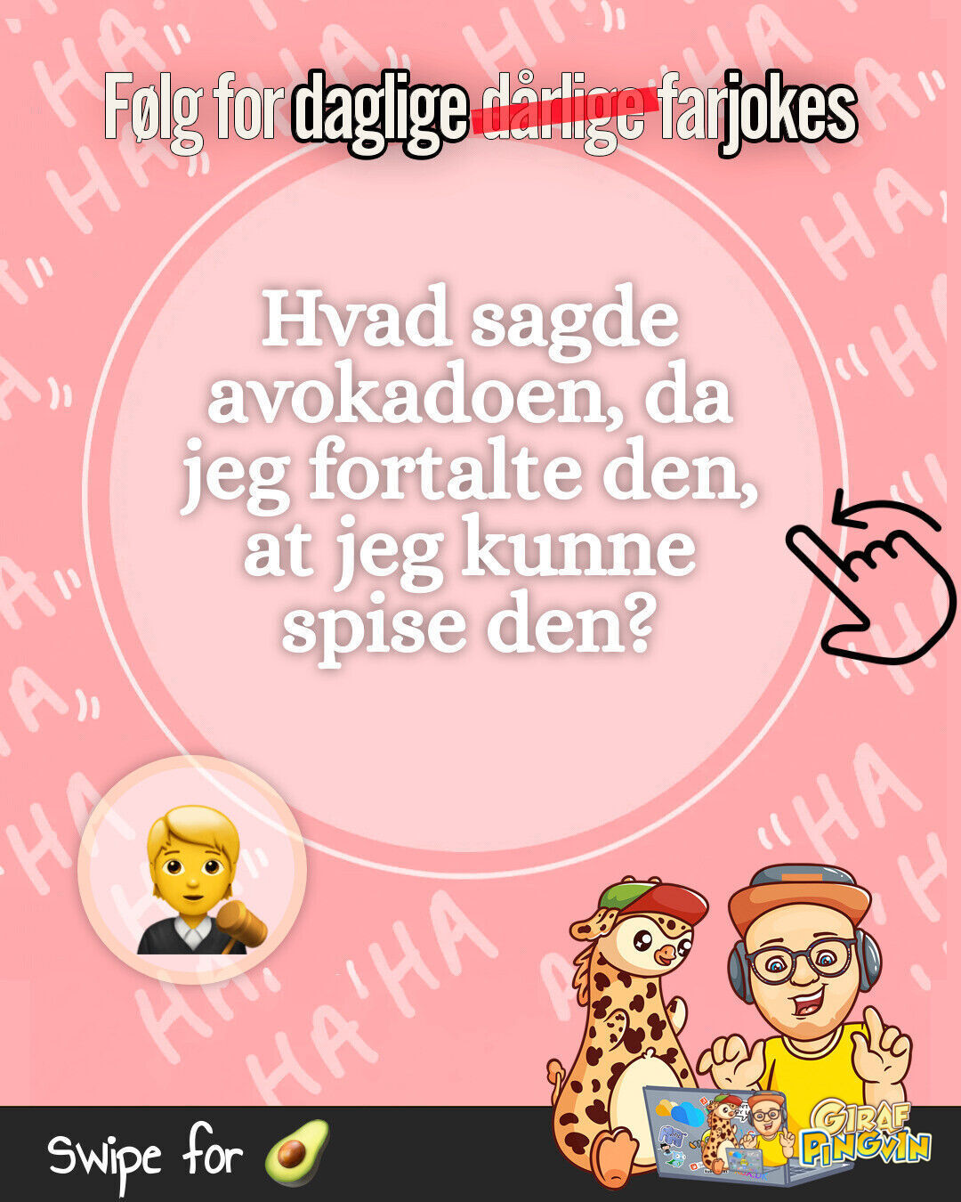 Tror I en avokado kan sagsøge dig? Hvad sagde avokadoen, da jeg fortalte den, at jeg kunne spise den? 🧑🏻⚖️ Vi ses i retten... 🥗 🫣😅🤣 Jeg siger dig, mine grøntsagsvitser er noget for sig.🥑
