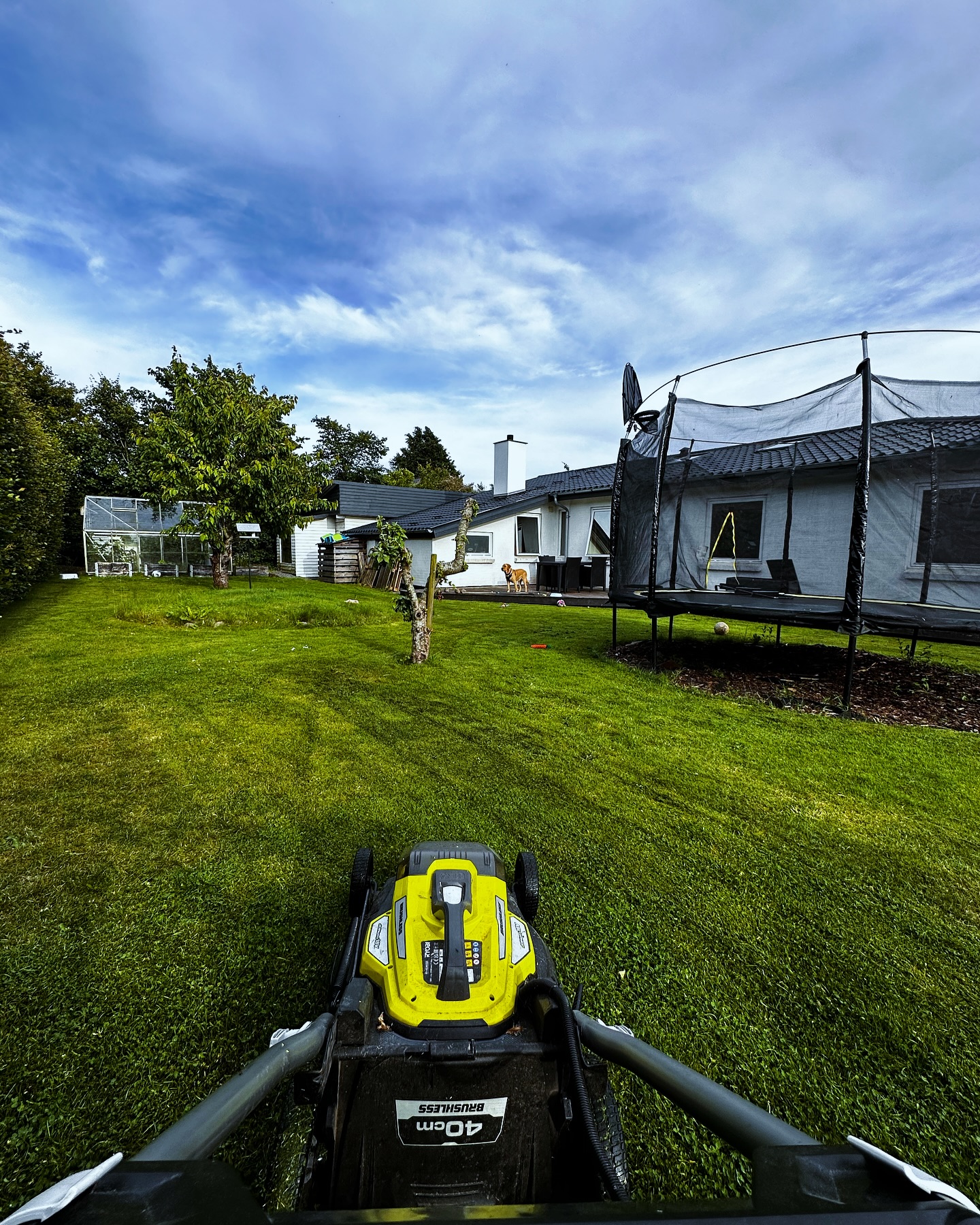 Efter de første 8 min med gøen, gik resten af plænen perfekt. 🌟 Han satte sig bare ned på terrassen og kiggede på mig slå græsplænen færdig uden at gø, og jeg roste ham med godbidder med jævne mellemrum. 👏❤️