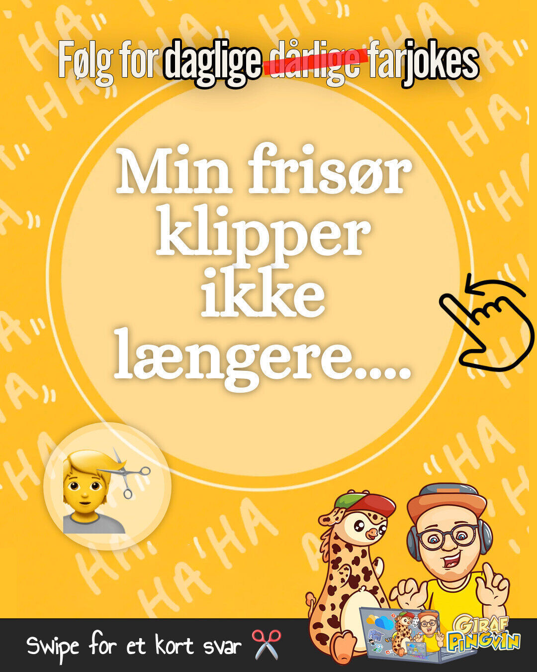 Hej alle min lækre følgere, og velkommen til endnu en episode af #GirafPingvinSmile 😂 Har I nogensinde tænkt på, hvorfor frisører aldrig klipper længere? 💇♀️✂️ Jeg gætter på, at jeg har fået mere end bare en frisure til at blive kortere i dag, jeg har også fået klippet lidt af jeres tolerance for dårlige vittigheder! 😂