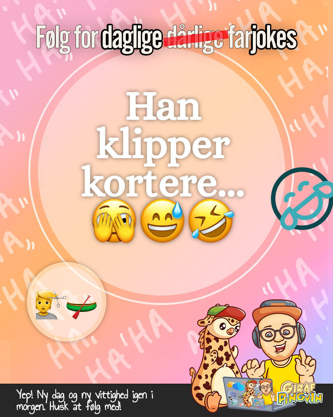 Tak fordi I følger med i #GirafPingvinSmile. Jeg håber, at dagens vittighed har løftet jeres humør lidt. Livet er for kort til at tage tingene for seriøst - husk at grine hver dag!