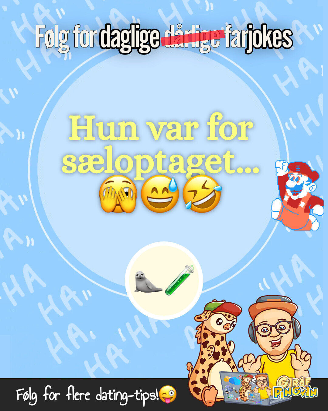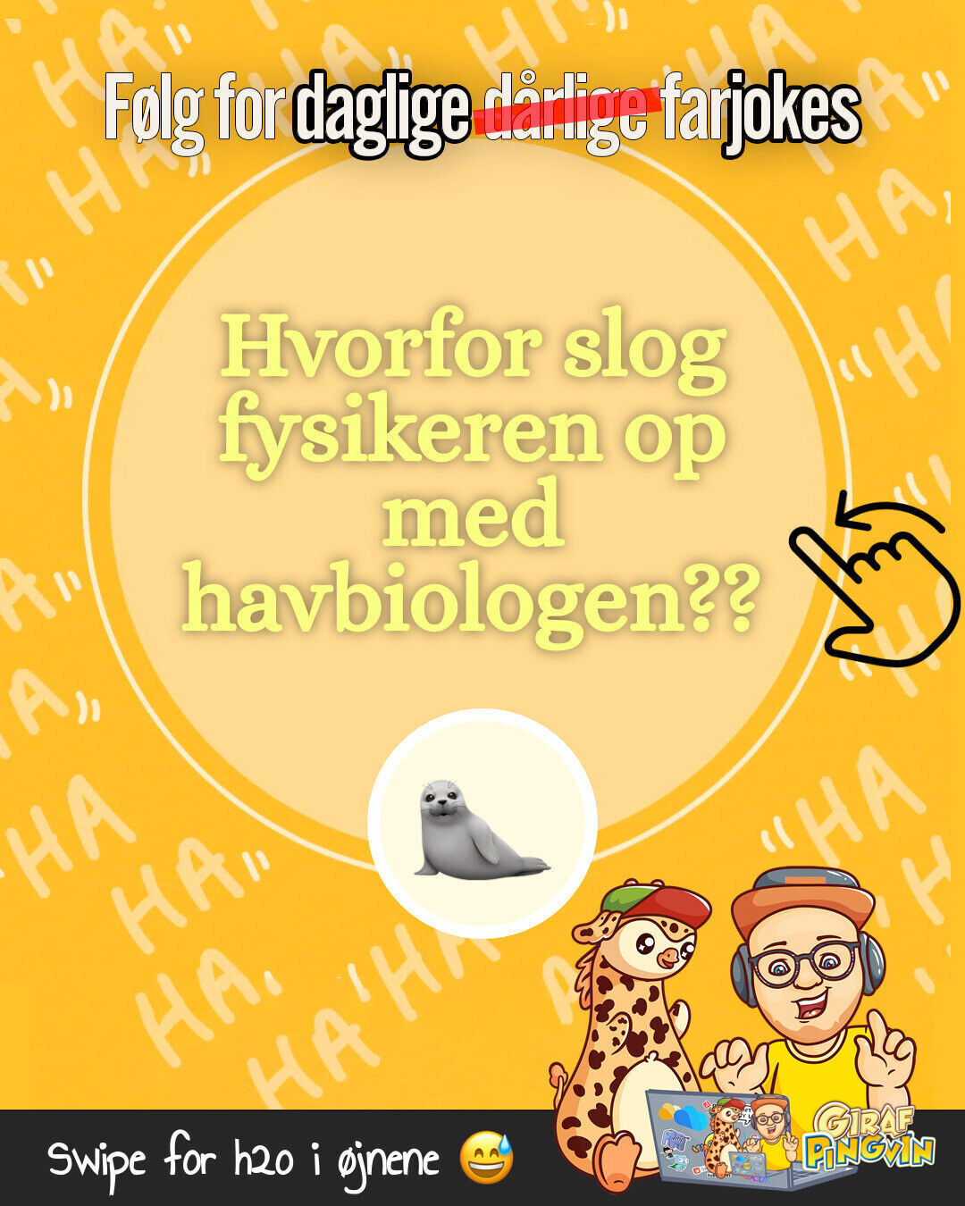 Dagens Farhumor fra Girafpingvin Hvorfor slog fysikeren op med havbiologen?? 🦭 Hun var for sæloptaget...🫣😅🤣 🦭🧪 Følg for flere dating-råd fra girafpingvin!😜
