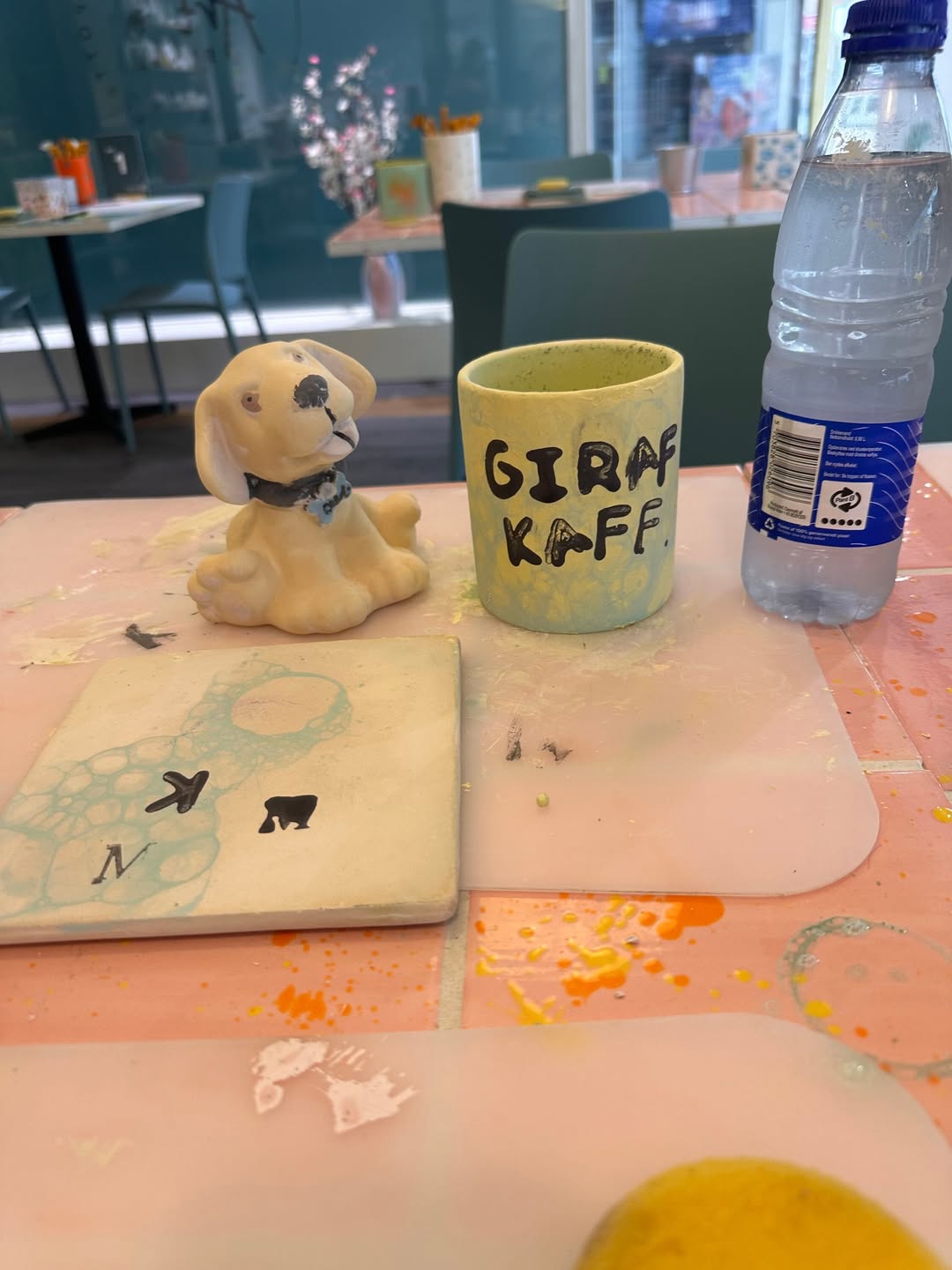 Tjek lige min nye kop! Min datter Tilde har malet den til mig. Men hvorfor står der "GIRAF KAFF'"? 🤔