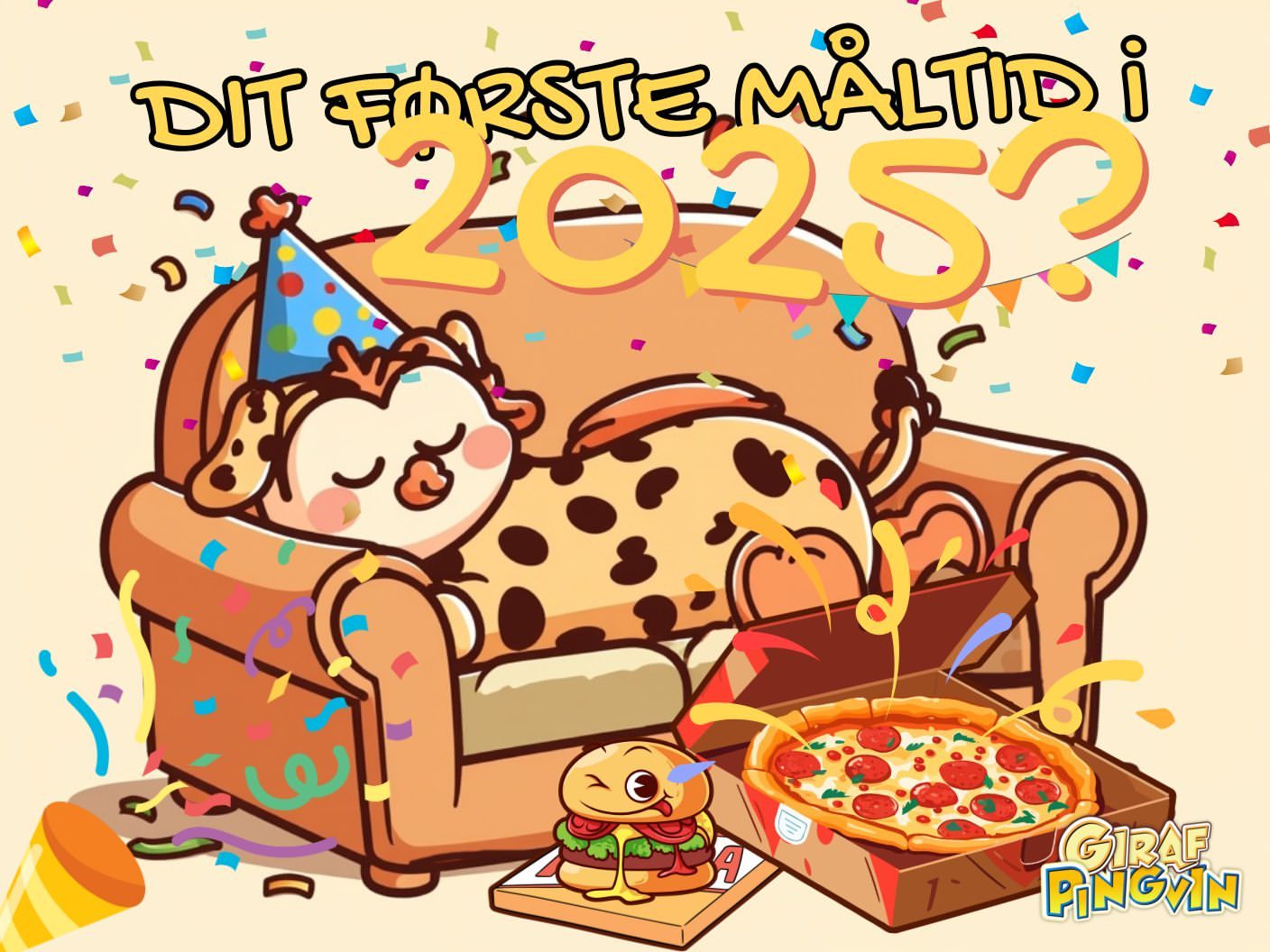 🥳💤 Godt nytår! Girafpingvinen snorker, men hvad drømmer du om at spise først i 2025? 🍕🍔🥗 En god lur eller et lækkert måltid? 😴😋