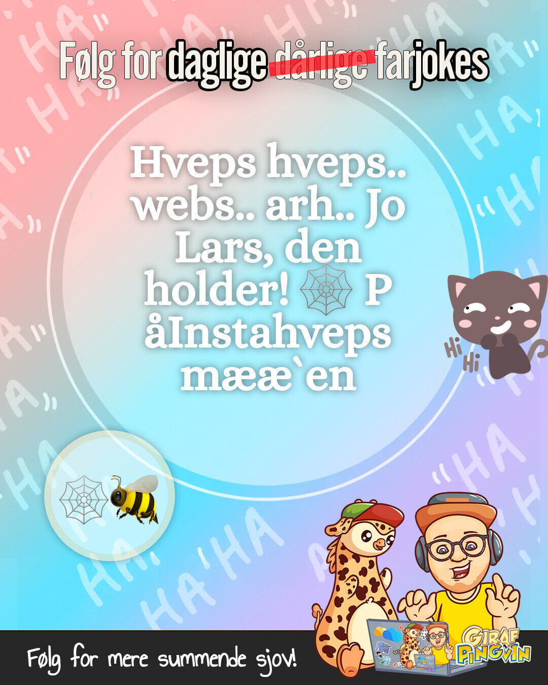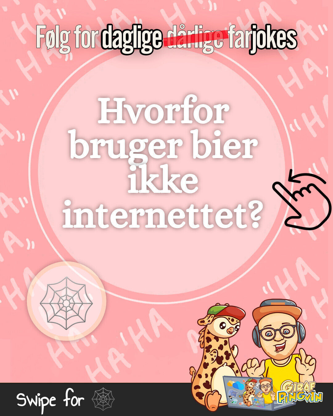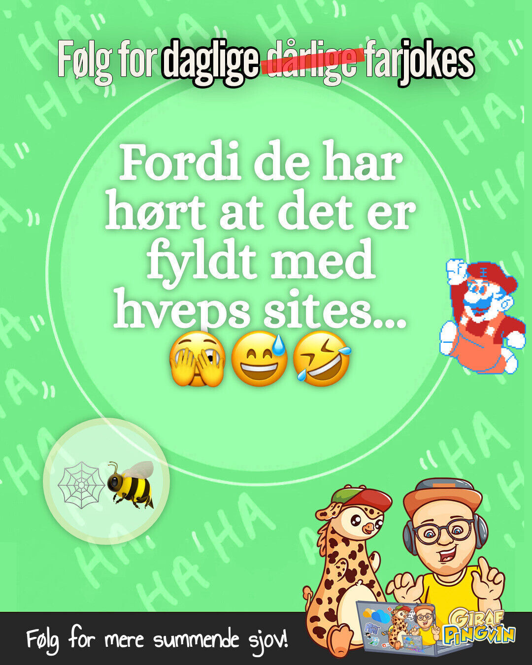 Girafpingvinere, klar til en far-joke? π¦π§ Hvorfor bruger bier ikke internettet? ππ» Fordi det er fyldt med hveps-sites! πΈοΈπ Del grinene, del humoren!