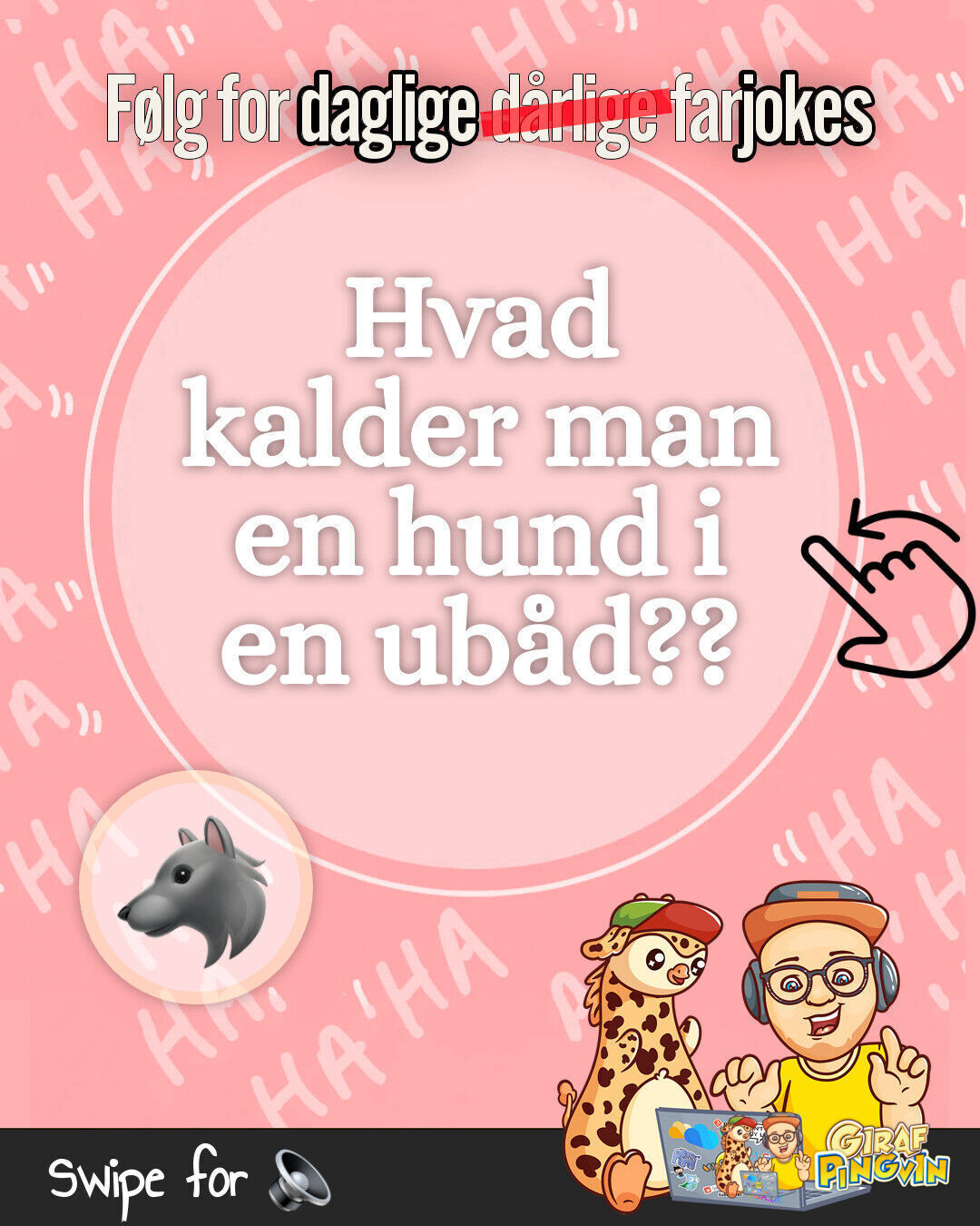 Er du klar, hapsere? 🖐️ Plat men sjov: Hvad kalder man en hund i en ubåd? En Subvuffer! 🐶⚓️ Og en ulv? En Underhyler! 🐺⚓️🤣😄 Kend andre sjove vittigheder? Del dem!