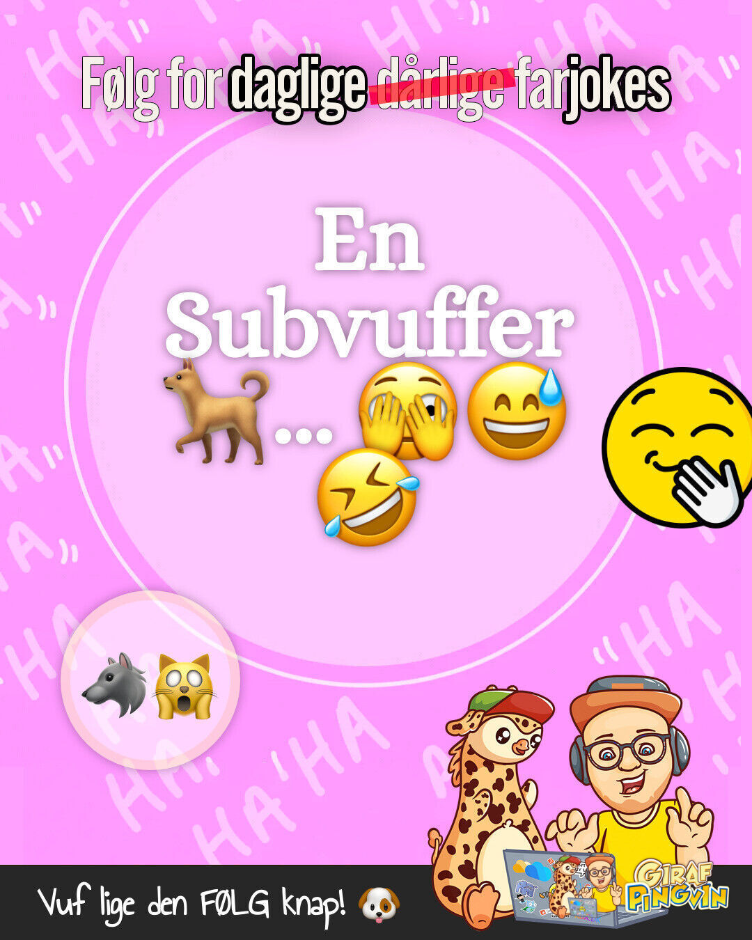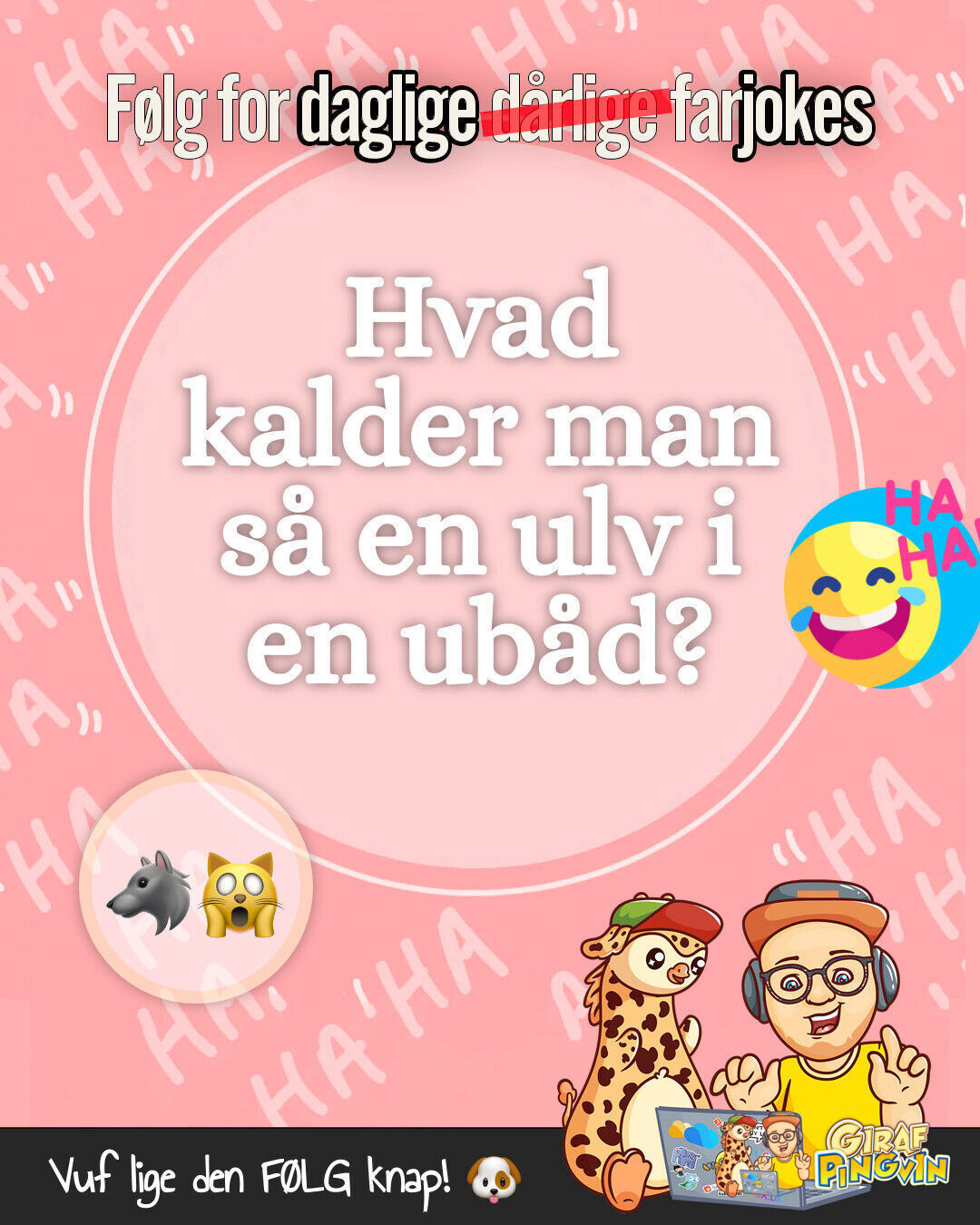 Hvad kalder man en hund i en ubåd? 🐶⚓️ Hmmm...🤔 En Subvuffer selvfølgelig! 🐕⚓️😂 Og hvad med en ulv, har du nogen idé? 🐺 🤷 En Underhyler!! 🐺⚓️🤣🤣 Jeg ved det, jeg ved det... det er plat, men hey, et smil gør bare dagen liiidt bedre, ikke?! 😄👍