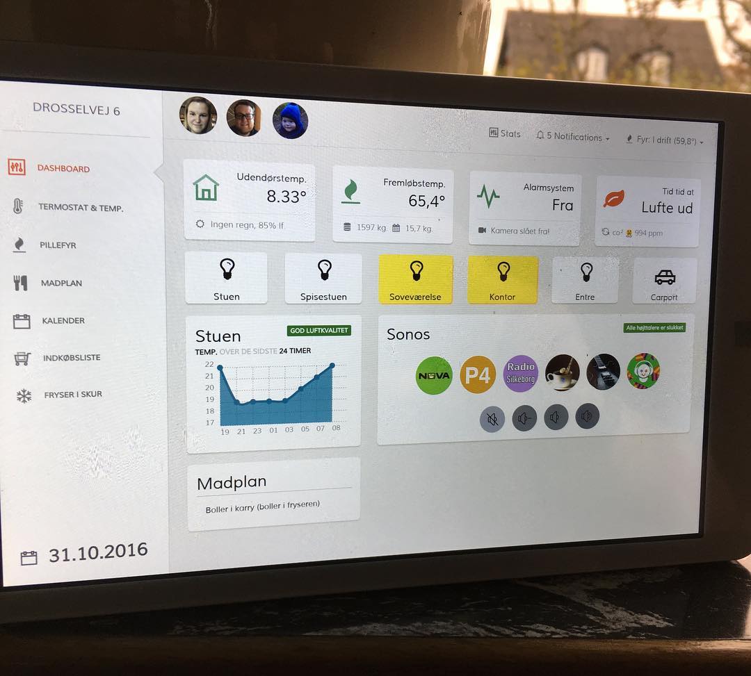 Smart hus-galore: Touch-tablets i stuen, køkken og entré styrer alt fra gulvvarme til temp.følere. High-tech hygge! 🏡🤓💡
