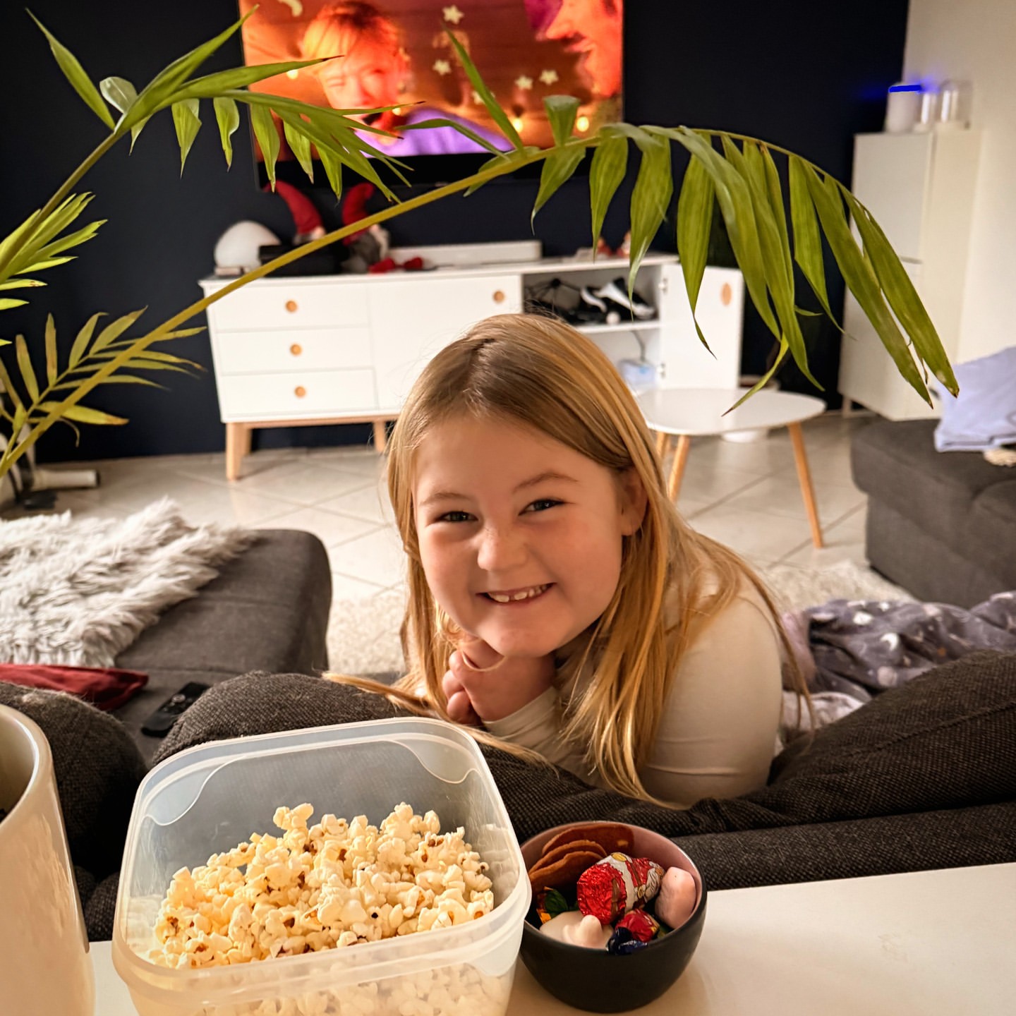Hygge med Tilde-fisen og Disney+ til juleferie, hvor popcorn og tegnefilm skaber magiske stunder. 🍿❤️