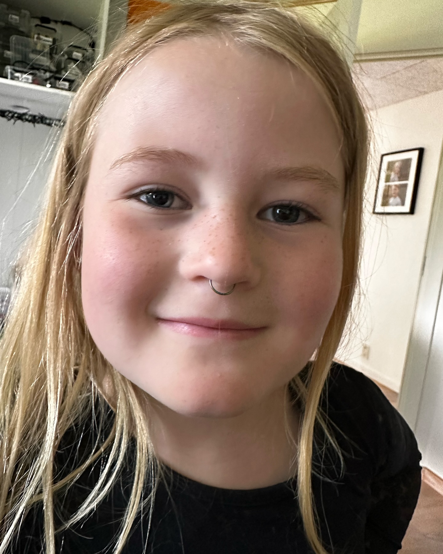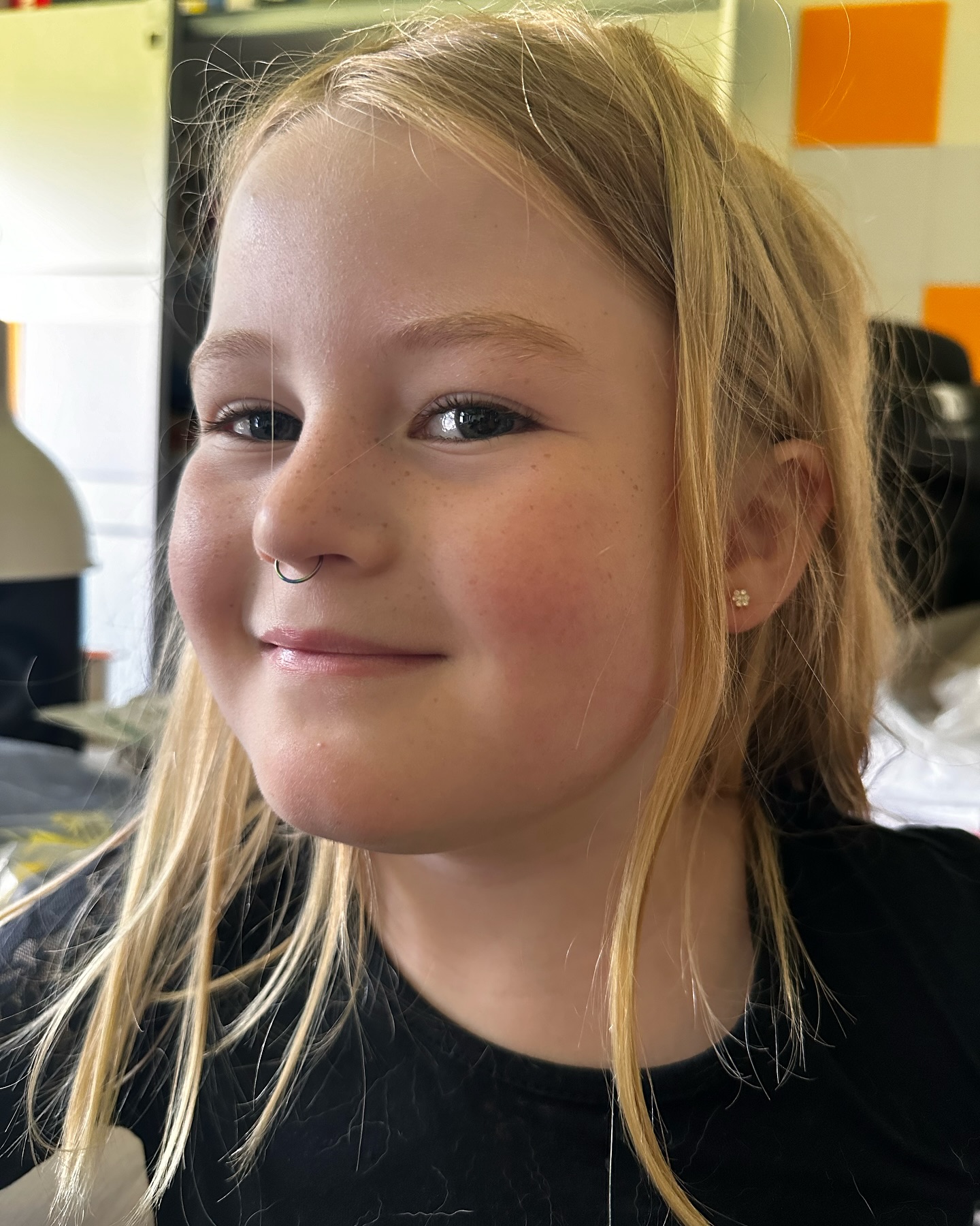 Du er allerede så sej og modig! Og ja, næsepircingen er fake, men stilen er on point 😉👧✨ Elsker dig til månen og tilbage! 🌙❤️